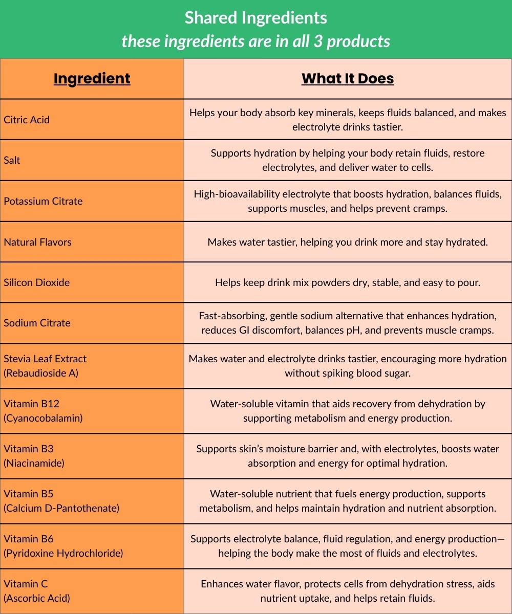 Here is a breakdown of the shared ingredients and their specific benefits in all 3 offerings;