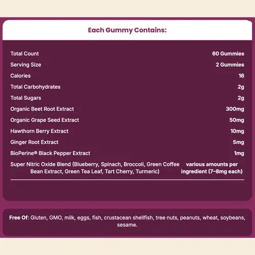 Organic beet root extract, organic grape seed extract, hawthorn berry extract, ginger root extract, BioPerine Black Pepper Extract, Super Nitric Oxide Blend (blueberry, spinach, broccoli, green coffee bean extract, green tea leaf, tart cherry, turmeric)