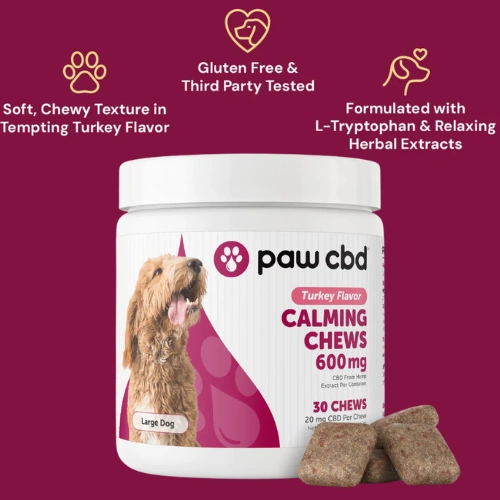 Anxious dogs may benefit from cbdMD calming chews. This veterinarian-formulated recipe includes Superior Broad Spectrum CBD and other soothing ingredients like passion flower and chamomile. In a delicious turkey flavor that dogs love. 30 soft chew dog treats. 600 milligrams per package. 20 milligrams of CBD per treat.
