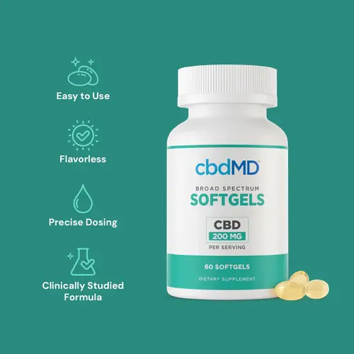cbdMD Broad Spectrum CBD Softgels are infused with Superior Broad Spectrum hemp extract with CBG, CBN, Vitamin E, & more. Easy, mess-free softgels. Multiple strengths available.