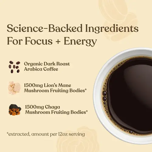 Organic dark roast Arabica coffee, organic lion's mane extract, organic wildcrafted chaga extract