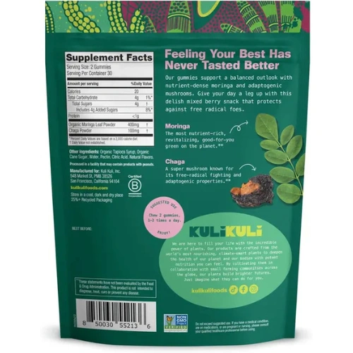 Give your wellness a leg up with Kuli Kuli plant-based superfood gummies. Contains revitalizing, nutrient-dense Moringa and free-radical fighting Chaga mushrooms. Crafted to help protect and balance your body, Kuli Kuli gummies make it easy and tasty to incorporate nature’s most powerful superfoods into your diet. Delicious mixed berry flavor.