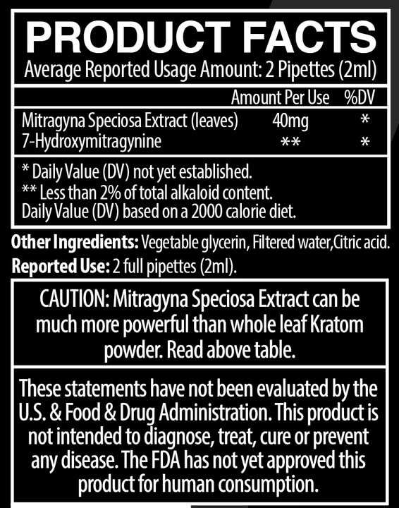 - Proprietary blend of 30% - 75% concentration of mitragynine per bottle