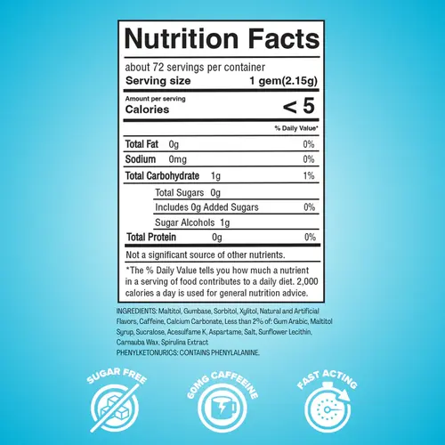 Sorbitol, Gumbase, Isomalt, Xylitol, Caffeine, Natural and Artificial Flavors, Less than 2% of: Magnesium Stearate, Gum Arabic, Aspartame, Sucralose, Acesulfame K, Color (FD&C Blue 1), Maltodextrin, Carnauba Wax.
