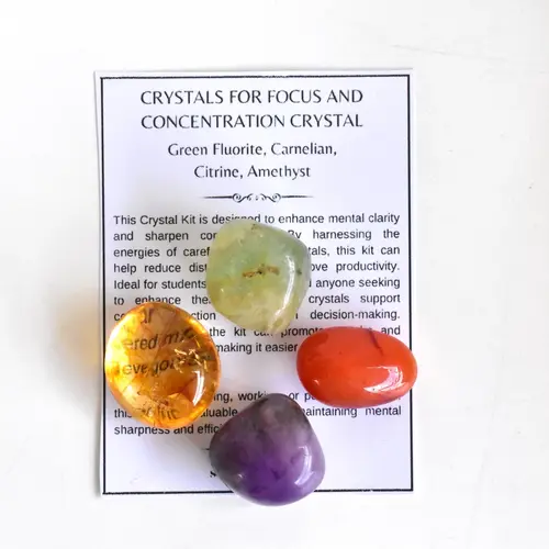 Let this gorgeous, handmade crystal set promote enhanced focus and concentration with 4 polished natural gemstones (Green Fluorite, Carnelian, Citrine, Amethyst) and a bracelet that are believed to promote mental clarity, sharpen concentration, reduce distractions, and improve productivity. Perfect for studying, working, or tackling personal projects. This kit also includes a Focus and Concentration Gemstone information card.