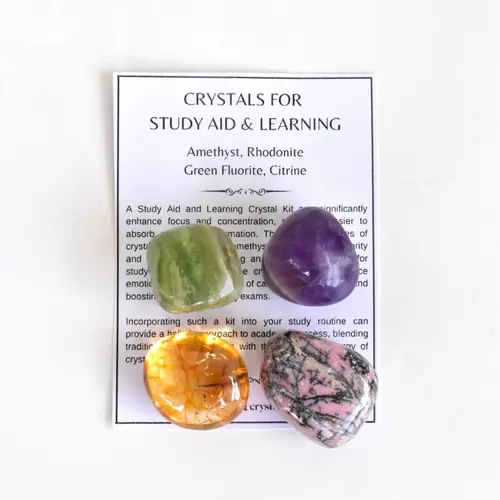 Let this beautiful, handmade crystal set aid you in your studies with 4 polished natural gemstones (Amethyst, Rhodonite, Green Fluorite, & Citrine) and a bracelet that are believed to support clarity, focus, and enhanced mental energy. The perfect combination for acing the exam. This kit also includes a Study & Learning Gemstone information card.